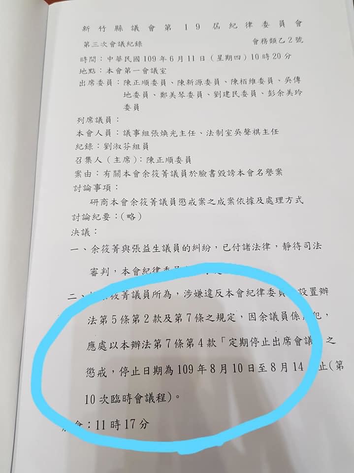 新竹縣議會昨天(17日)開第9次臨時會,在紀律委員會討論綠黨籍議員余筱菁日前在臉書上針對焚化爐興建案發文言論有否誹謗議會名譽,經表決以19比5票通過,余筱菁在下一次臨時會(8月10日至8月14日)中,被處以「定期停止出席議會」的懲戒。