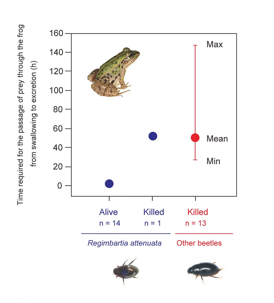 Regimbartia attenuata和其他甲蟲被青蛙吞下肚後,從吞嚥到從排泄口逃出的時間軸。照片來源:Kobe University