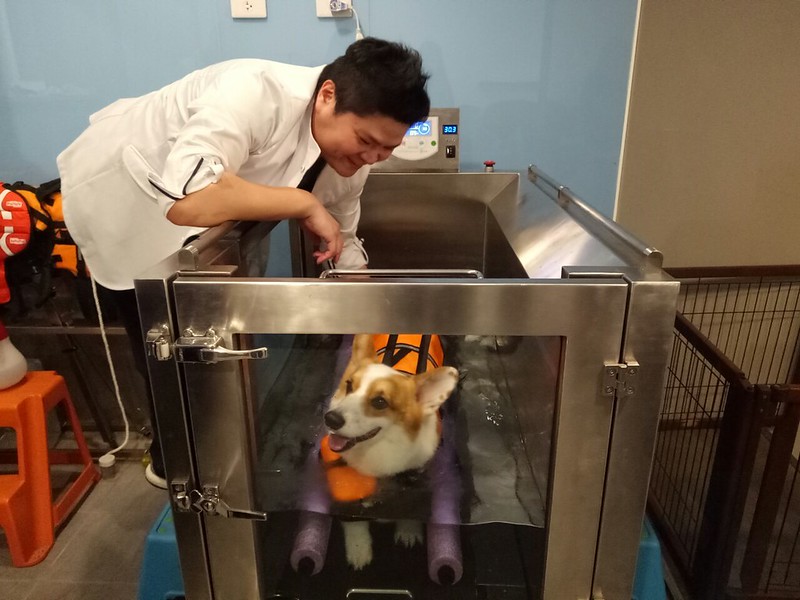 動物醫起對後肢癱瘓動物進行水療療程。照片來源:新北市動保處