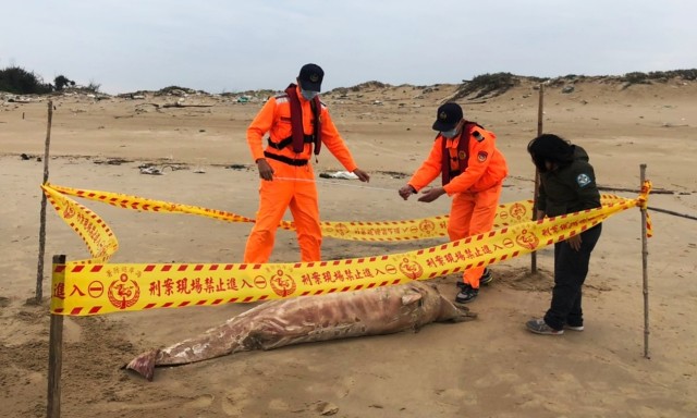 金門岸巡隊隊長吳建冠表示,復國墩安檢所人員昨天執行守望勤務時,在金沙鎮E54據點岸際沙灘處發現一隻死亡鯨豚屍體,隨即通報海巡署第12巡防區勤務管制中心,由勤務管制中心通報中華鯨豚協會、金門縣政府農林科及動植物金門檢疫站有關人員前往處理。