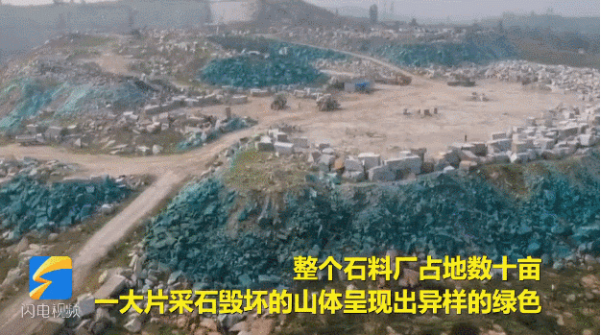 近年來,當局一直提倡「綠色礦業發展」模式。要求在合法開採的前提下,用規範的管理讓周圍百姓與礦山和諧共處。然而在新泰,居然將一座礦山塗上了綠漆。航拍畫面顯示,整個石料廠占地數十畝,一大片遭採石毀壞的山體呈現出異樣的綠色。