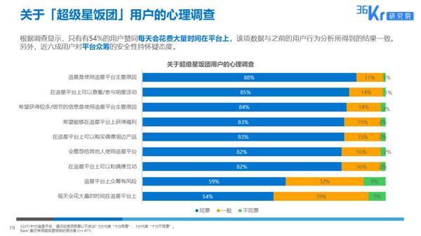調研報告中,36氪研究院以知名度最高的超級星飯糰為例,客觀分析總結了追星平台行業的發展現狀:總體來看用戶對追星平台行業整體的認同度較高;“平台上粉絲的素質”和“周邊產品的價格”是造成追星平台用戶不滿意的主要原因;6成以上的用戶在選擇追星平台時期待提供明星最新資訊以及可以購買到周邊商品或門票的服務;有超過8成的粉絲曾經有過購買明星代言產品的行為。